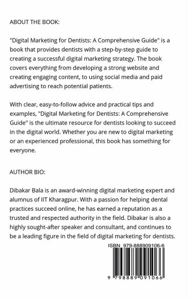 ""Digital Marketing for Dentists: A Comprehensive Guide"" is a valuable resource for dentists who are looking to grow their practice and reach more potential patients. This book provides a step-by-step guide to creating a successful digital marketing strategy, covering everything from developing a strong website and creating engaging content, to using social media and paid advertising to reach your target audience. With clear, easy-to-follow advice and practical tips and examples, ""Digital Marketing for Dentists: A Comprehensive Guide"" is the ultimate resource for dentists looking to succeed in the digital world. Whether you are new to digital marketing or an experienced professional, this book has something for everyone. Get your copy today and start growing your dental practice with digital marketing.