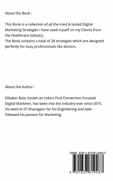 Doctors are Busy & Helpful Professionals. Yet, in todays day and age, we just can't ignore Digital Marketing anymore. This Book is a collection of all the strategies which I have successfully implemented on my own clients from the healthcare industry. The Book has 28 proven Digital Marketing Strategies which are Easy to Implement for Busy Professionals like Doctors.
