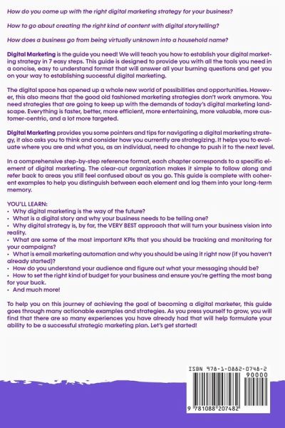 How do you come up with the right digital marketing strategy for your business? How to go about creating the right kind of content with digital storytelling? How does a business go from being virtually unknown into a household name? Digital Marketing is the guide you need! We will teach you how to establish your digital marketing strategy in 7 easy steps. This guide is designed to provide you with all the tools you need in a concise, easy to understand format that will answer all your burning questions and get you on your way to establishing successful digital marketing. The digital space has opened up a whole new world of possibilities and opportunities. However, this also means that the good old fashioned marketing strategies don't work anymore. You need strategies that are going to keep up with the demands of today's digital marketing landscape. Everything is faster, better, more efficient, more entertaining, more valuable, more customer-centric, and a lot more targeted. Digital Marketing provides you some pointers and tips for navigating a digital marketing strategy, it also asks you to think and consider how you currently are strategizing. It helps you to evaluate where you are and what you, as an individual, need to change to push it to the next level. In a comprehensive step-by-step reference format, each chapter corresponds to a specific element of digital marketing. The clear-cut organization makes it simple to follow along and refer back to areas you still feel confused about as you go. This guide is complete with coherent examples to help you distinguish between each element and log them into your long-term memory. YOU'LL LEARN:Why digital marketing is the way of the future? What is a digital story and why your business needs to be telling one? Why digital strategy is, by far, the VERY BEST approach that will turn your business vision into reality. What are some of the most important KPIs that you should be tracking and monitoring for your campaigns? What is email marketing automation and why you should be using it right now (if you haven't already started)? How do you understand your audience and figure out what your messaging should be? How to set the right kind of budget for your business and ensure you're getting the most bang for your buck. And much more! To help you on this journey of achieving the goal of becoming a digital marketer, this guide goes through many actionable examples and strategies. As you press yourself to grow, you will find that there are so many experiences you have already had that will help formulate your ability to be a successful strategic marketing plan. Let's get started!