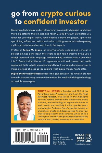 A 2024 ERIC HOFFER BOOK AWARD CATEGORY FINALIST Are you curious about cryptocurrency but overwhelmed by the noise and misinformation? Digital Money Demystified is the essential guide you've been searching for, offering a clear, reliable path through the complex world of cryptocurrency and blockchain technology. In this award-nominated book, renowned expert Dr. Tonya M. Evans, a professor of law and celebrated thought leader in cryptocurrency, breaks down these innovative technologies with clarity and precision. As a prominent keynote speaker, board member of the Digital Currency Group, and former Chair of the MakerDAO Ecosystem Growth Foundation, Dr. Evans is recognized as a pioneer in the field. Her extensive experience as a digital asset law and policy advisor, combined with her legal and financial expertise, enables her to make the digital economy accessible to all. What you will learn: * The Basics: Understand how blockchain technology works and why it's revolutionizing industries globally. * Cryptocurrency Facts vs. Fiction: Distinguish between hype and real opportunities in the crypto space. * Investment Insights: Gain the confidence to explore cryptocurrencies and digital assets safely. * Security and Regulation: Learn about the evolving regulatory landscape and how it affects your use and investment in digital money. * Future Trends: Explore the future of decentralized finance and the global impact of digital currencies. Whether you're a beginner or looking to deepen your knowledge, Digital Money Demystified will equip you with the insights and tools you need to confidently navigate and thrive in the digital economy.