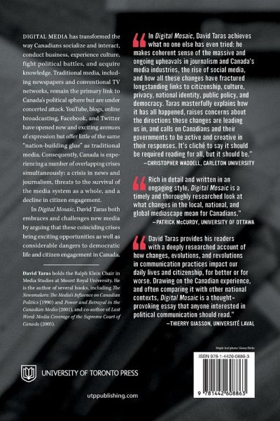 Digital Media has transformed the way Canadians socialize and interact, conduct business, experience culture, fight political battles, and acquire knowledge. Traditional media, including newspapers and conventional TV networks, remain the primary link to Canada's political sphere but are under concerted attack. YouTube, blogs, online broadcasting, Facebook, and Twitter have opened new and exciting avenues of expression but offer little of the same "nation-building glue" as traditional media. Consequently, Canada is experiencing a number of overlapping crises simultaneously: a crisis in news and journalism, threats to the survival of the media system as a whole, and a decline in citizen engagement. In Digital Mosaic, David Taras both embraces and challenges new media by arguing that these coinciding crises bring exciting opportunities as well as considerable dangers to democratic life and citizen engagement in Canada.