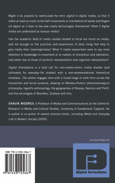 Digital Orientations is a bold call for non-media-centric media studies (and ultimately for everyday-life studies) with a non-representational theoretical emphasis. The author engages here with a broad range of work from across the humanities and social sciences, drawing on Merleau-Ponty's phenomenological philosophy, Ingold's anthropology, the geographies of Massey, Seamon and Thrift, and the sociologies of Bourdieu, Sudnow and Urry.