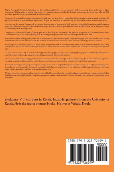 "Digital Photography Essentials: Techniques and Tips for Stunning Shots" is your comprehensive guide to mastering the art and science of digital photography. Whether you're an aspiring photographer or a seasoned enthusiast, this book is designed to empower you with the knowledge and skills needed to capture breath-taking images that leave a lasting impact. Through a well-structured and engaging approach, this book takes you from the very basics of digital photography to more advanced techniques. We begin by unravelling the mysteries of your digital camera, helping you understand its various settings and the crucial role of the sensor in image quality. From there, we dive into the fundamentals of exposure, the cornerstone of photography. You'll learn how to control light to achieve perfectly balanced images and effectively convey your desired mood and message. We explore the concept of focus and depth of field, allowing you to sharpen your vision and create images with stunning clarity. Composition is a fundamental aspect of photography, and we delve deep into the principles that guide the arrangement of elements within your frame. Discover how to use the rule of thirds, leading lines, and framing techniques to create visually compelling and harmonious shots. No matter the subject, lighting plays a pivotal role in photography. We guide you through the art of capturing light, both natural and artificial, to bring out the best in your subjects and scenes. You'll also learn how to utilize colour to enhance the visual impact of your images and evoke emotions. As you progress, we unravel the mysteries of shutter speed, giving you the tools to freeze fast-moving action or create mesmerizing motion blur. Taking control of your camera's manual mode allows you to become a true master of your craft, and we demystify this process to unleash your creative potential fully. The book caters to a wide range of interests, including portrait photography, landscape, macro, and night photography. You'll find dedicated chapters on each of these genres, offering specialized tips and techniques to excel in different environments. Of course, no contemporary photography book would be complete without addressing the role of post-processing. Learn how to edit your images like a pro, taking advantage of digital darkroom tools to fine-tune and enhance your photographs without compromising their authenticity. Packed with inspiring examples, step-by-step guides, and practical exercises, "Digital Photography Essentials: Techniques and Tips for Stunning Shots" aims to be your go-to resource for honing your photography skills. Let your creativity flow as you explore the world through the lens, and witness your images evolve from ordinary snapshots to extraordinary works of art. Whether you aspire to create compelling visuals for personal fulfilment, social media, or professional purposes, this book is your gateway to unlocking the full potential of digital photography. Join us on this captivating journey, and together, let's capture the beauty and wonders of life through the lens of your camera