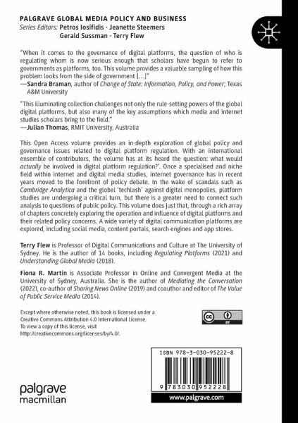 1. Introduction by Terry Flew & Fiona R. Martin.- 2.Can Journalism Survive in the Age of Platform Monopolies? Confronting Facebook's Negative Externalities by Victor Pickard.- 3. Platforms and the Press: Regulatory Interventions to Address an Imbalance of Power by Philip M. Napoli & Asa Royal.- 4. EU Digital Services Act: The White Hope of Intermediary Regulation by Amélie P. Heldt.- 5. Holding the Line: Responsibility, Digital Citizenship and the Platforms by Lelia Green and Viet Tho Le.- 6. Regulating platforms' algorithmic brand culture: the instructive case of alcohol marketers on social media by Nicholas Carah & Sven Brodmerkel.- 7. Digital Platforms as Policy Actors by Pawel Popiel.- 8. Global platforms and local networks: an institutional account of the Australian news media bargaining code by James Meese & Edward Hurcombe.- 9. Regulating Chinese and North American Digital Media in Australia: Facebook and WeChat as Case Studies by Chunmeizi Su.-10. State actor policy and regulation across the platform-SVOD divide by Stuart Cunningham & Oliver Eklund.- 11. Regulating discoverability in subscription video-on-demand services by Ramon Lobato & Alexa Scarlata.- 12. The Broken Internet and Platform Regulation: Promises and Perils by Winseck Dwayne.- 13. Self-regulation and discretion by Nicholas Suzor & Rosalie Gillet.- 14 Beyond the Paradox of Trust and Digital Platforms: Populism and the Reshaping of Internet Regulations by Terry Flew.