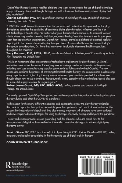 "This is an honest and clear presentation of technology's implications for play therapy. Dr. Stone's innovative book shows the reader the varying way technology can be incorporated in the playroom, including new case examples using popular games such as Roblox and Animal Crossing. The new edition also explores the process of providing telemental health therapy. The completeness in addressing every aspect of what digital play therapy encompasses and proposes is impressive! If you have ever thought about how to use technology therapeutically in any capacity or how technology-based play can be successful in play sessions, this is your guide." - Robert Jason Grant, EdD, LPC, RPT-S, ACAS, author, speaker, and creator of AutPlay® Therapy, USA