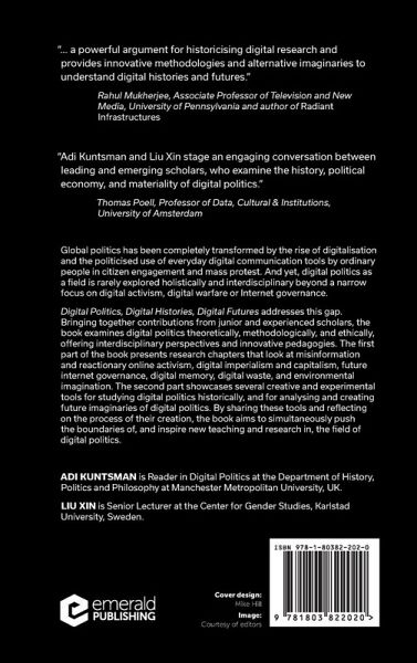 Digital politics is rarely explored holistically and interdisciplinary beyond a focus on digital activism, digital warfare or Internet governance. Digital Politics, Digital Histories, Digital Futures addresses this gap, initiating conversations about digital politics to a range of disciplines, developing new pedagogy for the field.