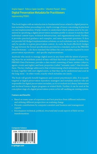 1. An Introduction to Implementing Digital Preservation Metadata.- 2. How to Develop a Digital Preservation Metadata Profile: Risk and Requirements Analysis.- 3. An Introduction to the PREMIS Data Dictionary for Digital Preservation Metadata.- 4. Implementation Examples.- 5. Serialization of PREMIS.- 6. Digital Preservation Metadata in a Metadata Ecosystem.- 7. Digital Preservation Metadata Systems and Tools.- Conformance with PREMIS.