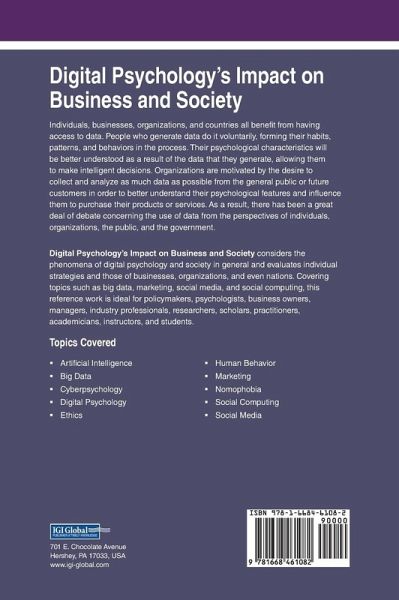 Individuals, businesses, organizations, and countries all benefit from having access to data. People who generate data do it voluntarily, forming their habits, patterns, and behaviors in the process. Their psychological characteristics will be better understood as a result of the data that they generate, allowing them to make intelligent decisions. Organizations are motivated by the desire to collect and analyze as much data as possible from the general public or future customers in order to better understand their psychological features and influence them to purchase their products or services. As a result, there has been a great deal of debate concerning the use of data from the perspectives of individuals, organizations, the public, and the government. Digital Psychology's Impact on Business and Society considers the phenomena of digital psychology and society in general and evaluates individual strategies and those of businesses, organizations, and even nations. Covering topics such as big data, marketing, social media, and social computing, this reference work is ideal for policymakers, psychologists, business owners, managers, industry professionals, researchers, scholars, practitioners, academicians, instructors, and students.