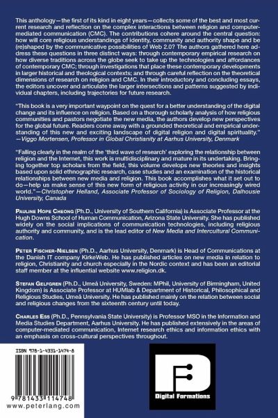 Pauline Hope Cheong (PhD, University of Southern California) is Associate Professor at the Hugh Downs School of Human Communication, Arizona State University. She has published widely on the social implications of communication technologies, including religious authority and community, and is the lead editor of New Media and Intercultural Communication. Peter Fischer-Nielsen (PhD, Aarhus University, Denmark) is Head of Communications at the Danish IT company KirkeWeb. He has published articles on new media in relation to religion, Christianity and church especially in the Nordic context and has been an editorial staff member at the influential website www.religion.dk. Stefan Gelfgren (PhD, Umeå University, Sweden: MPhil, University of Birmingham, United Kingdom) is Associate Professor at HUMlab & Department of Historical, Philosophical and Religious Studies, Umeå University. He has published mainly on the relation between social and religious changes from the sixteenth century until today. Charles Ess (PhD, Pennsylvania State University) is Professor MSO in the Information and Media Studies Department, Aarhus University. He has published extensively in the areas of computer-mediated communication, Internet research ethics and information ethics with an emphasis on cross-cultural perspectives throughout.