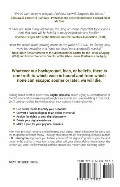 Whatever our background, bias, or beliefs, there is one truth to which each is bound and from which none can escape: sooner or later, we will die. Talking about death is never easy. Digital Remains: Death, Dying & Remembrance in the Tech Generation makes expert insights accessible and unintimidating. In this book, you'll gain up-to-date knowledge about your options, including how to: Use social media to notify your networks. Convert a Facebook page to an online memorial. Assign the rights to your digital property. Delete your digital existence. Make a plan for your physical remains. After your physical remains are laid to rest, your digital remains become the story you tell to generations that follow. Through this thoughtfully designed guidebook, author J.H. Harrington empowers you to take control of the digital imprints of your life and become the author of your own story. What will your digital debris reveal about the person you were, the life you led, and the impact you made? Start planning today.