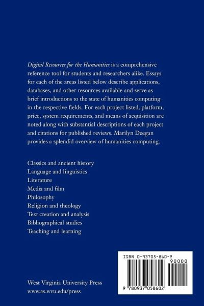 A comprehensive reference tool in humanities computing. Essays in nine disciplines describe resources and introduce the state of humanities computing. Platform, price, system requirements, and means of acquisition are noted with substantial descriptions of each project plus review citations.