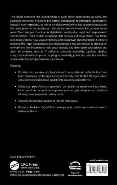 This book examines the digitalization of rock scour engineering at dams and hydraulic structures. The challenges of rock scour digitalization are discussed, such as parametric standardization, real-time data acquisition, data analysis and interpretation, quantitative rock mass indices, new ways of thinking, and digital twin implementation.