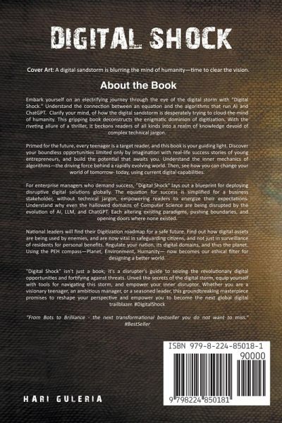 Embark yourself on an electrifying journey through the eye of the digital storm with "Digital Shock." Understand the connection between an equation and the algorithms that run AI and ChatGPT. Clarify your mind, of how the digital sandstorm is desperately trying to cloud the mind of humanity. This gripping book deconstructs the enigmatic dominion of digitization. With the riveting allure of a thriller, it beckons readers of all kinds into a realm of knowledge devoid of complex technical jargon. Primed for the future, every teenager is a target reader, and this book is your guiding light. Discover your boundless opportunities limited only by imagination with real-life success stories of young entrepreneurs, and build the potential that awaits you. Understand the inner mechanics of algorithms-the driving force behind a rapidly evolving world. Then, see how you can change your world of tomorrow- today, using current digital capabilities. For enterprise managers who demand success, "Digital Shock" lays out a blueprint for deploying disruptive digital solutions globally. The equation for success is simplified for a business stakeholder, without technical jargon, empowering readers to energize their expectations. Understand why even the hallowed domains of Computer Science are being disrupted by the evolution of AI, LLM, and ChatGPT. Each altering existing paradigms, pushing boundaries, and opening doors where none existed. National leaders will find their Digitization roadmap for a safe future. Find out how digital assets are being used by enemies, and are now vital in safeguarding citizens, and not just in surveillance of residents for personal benefits. Regulate your nation, its digital domains, and thus the planet. Using the PEH compass-Planet, Environment, Humanity- now becomes our ethical filter for designing a better world. "Digital Shock" isn't just a book; it's a disrupter's guide to seizing the revolutionary digital opportunities and fortifying against threats. Unveil the secrets of the digital storm, equip yourself with tools for navigating this storm, and empower your inner disruptor. Whether you are a visionary teenager, an ambitious manager, or a seasoned leader, this groundbreaking masterpiece promises to reshape your perspective and empower you to become the next global digital trailblazer. #DigitalShock "From Bots to Brilliance - the next transformational bestseller you do not want to miss." #BestSeller