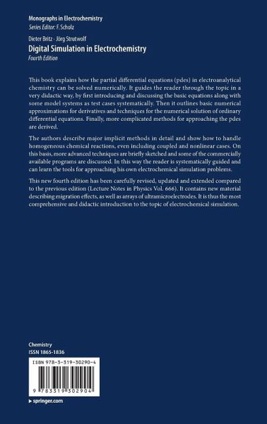 The authors describe major implicit methods in detail and show how to handle homogeneous chemical reactions, even including coupled and nonlinear cases. On this basis, more advanced techniques are briefly sketched and some of the commercially available programs are discussed. In this way the reader is systematically guided and can learn the tools for approaching his own electrochemical simulation problems.