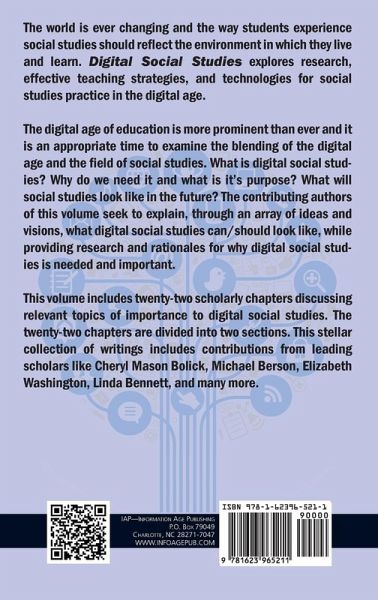 A volume in Teaching and Learning Social Studies Book Series Series Editor William Benedict Russell III, University of Central Florida The world is ever changing and the way students experience social studies should reflect the environment in which they live and learn. Digital Social Studies explores research, effective teaching strategies, and technologies for social studies practice in the digital age. The digital age of education is more prominent than ever and it is an appropriate time to examine the blending of the digital age and the field of social studies. What is digital social studies? Why do we need it and what is its purpose? What will social studies look like in the future? The contributing authors of this volume seek to explain, through an array of ideas and visions, what digital social studies can/should look like, while providing research and rationales for why digital social studies is needed and important. This volume includes twenty-two scholarly chapters discussing relevant topics of importance to digital social studies. The twenty-two chapters are divided into two sections. This stellar collection of writings includes contributions from leading scholars like Cheryl Mason Bolick, Michael Berson, Elizabeth Washington, Linda Bennett, and many more.