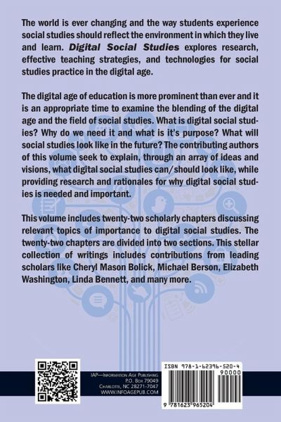 A volume in Teaching and Learning Social Studies Book Series Series Editor William Benedict Russell III, University of Central Florida The world is ever changing and the way students experience social studies should reflect the environment in which they live and learn. Digital Social Studies explores research, effective teaching strategies, and technologies for social studies practice in the digital age. The digital age of education is more prominent than ever and it is an appropriate time to examine the blending of the digital age and the field of social studies. What is digital social studies? Why do we need it and what is its purpose? What will social studies look like in the future? The contributing authors of this volume seek to explain, through an array of ideas and visions, what digital social studies can/should look like, while providing research and rationales for why digital social studies is needed and important. This volume includes twenty-two scholarly chapters discussing relevant topics of importance to digital social studies. The twenty-two chapters are divided into two sections. This stellar collection of writings includes contributions from leading scholars like Cheryl Mason Bolick, Michael Berson, Elizabeth Washington, Linda Bennett, and many more.