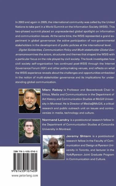 Digital Solidarities, Communication Policy and Multi-stakeholder Global Governance examines the actors, structures and themes that shaped the WSIS with a particular focus on the role played by civil society. The book investigates how civil society self-organization has continued post-WSIS through the Internet Governance Forum (IGF) and other policymaking venues, and reflects on what the WSIS experience reveals about the challenges and opportunities embedded in the notion of multi-stakeholder governance and its implications for understanding global communication.