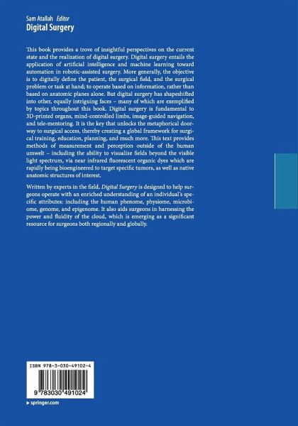 This book provides a trove of insightful perspectives on the current state and the realization of digital surgery. Digital surgery entails the application of artificial intelligence and machine learning toward automation in robotic-assisted surgery. More generally, the objective is to digitally define the patient, the surgical field, and the surgical problem or task at hand; to operate based on information, rather than based on anatomic planes alone. But digital surgery has shapeshifted into other, equally intriguing faces - many of which are exemplified by topics throughout this book. Digital surgery is fundamental to 3D-printed organs, mind-controlled limbs, image-guided navigation, and tele-mentoring. It is the key that unlocks the metaphorical doorway to surgical access, thereby creating a global framework for surgical training, education, planning, and much more. This text provides methods of measurement and perception outside of the human umwelt - including the ability to visualize fields beyond the visible light spectrum, via near infrared fluorescent organic dyes which are rapidly being bioengineered to target specific tumors, as well as native anatomic structures of interest. Written by experts in the field, Digital Surgery is designed to help surgeons operate with an enriched understanding of an individual's specific attributes: including the human phenome, physiome, microbiome, genome, and epigenome. It also aids surgeons in harnessing the power and fluidity of the cloud, which is emerging as a significant resource for surgeons both regionally and globally.