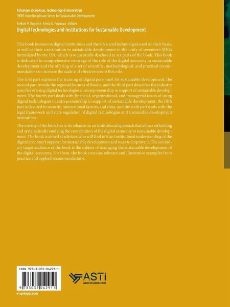 This book focuses on digital institutions and the advanced technologies used on their basis, as well as their contribution to sustainable development in the unity of seventeen SDGs formulated by the UN, which is sequentially disclosed in six parts of the book. This book is dedicated to comprehensive coverage of the role of the digital economy in sustainable development and the offering of a set of scientific, methodological, and practical recommendations to increase the scale and effectiveness of this role.