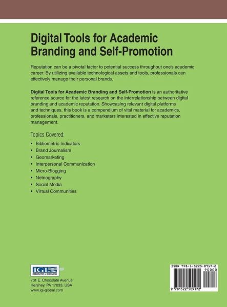 Reputation can be a pivotal factor to potential success throughout one's academic career. By utilizing available technological assets and tools, professionals can effectively manage their personal brands. Digital Tools for Academic Branding and Self-Promotion is an authoritative reference source for the latest research on the interrelationship between digital branding and academic reputation. Showcasing relevant digital platforms and techniques, this book is a compendium of vital material for academics, professionals, practitioners, and marketers interested in effective reputation management.