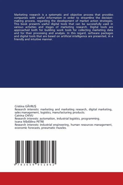 Marketing research is a systematic and objective process that provides companies with useful information in order to streamline the decision-making process, regarding the development of market action strategies. This book presents useful digital tools that can be successfully used in various activities and stages of marketing research. Digital tools are approached both for building work tools for collecting marketing data and for their processing and analysis. In this regard, software packages and digital tools that are based on artificial intelligence are presented, in a friendly and intuitive manner.
