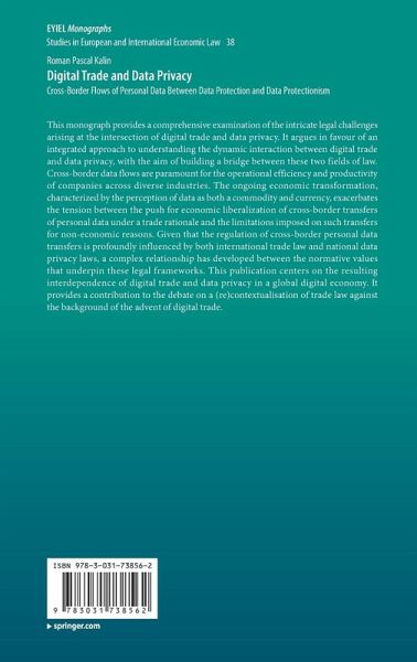 This monograph provides a comprehensive examination of the intricate legal challenges arising at the intersection of digital trade and data privacy. It argues in favour of an integrated approach to understanding the dynamic interaction between digital trade and data privacy, with the aim of building a bridge between these two fields of law. Cross-border data flows are paramount for the operational efficiency and productivity of companies across diverse industries. The ongoing economic transformation, characterized by the perception of data as both a commodity and currency, exacerbates the tension between the push for economic liberalization of cross-border transfers of personal data under a trade rationale and the limitations imposed on such transfers for non-economic reasons. Given that the regulation of cross-border personal data transfers is profoundly influenced by both international trade law and national data privacy laws, a complex relationship has developed between the normative values that underpin these legal frameworks. This publication centers on the resulting interdependence of digital trade and data privacy in a global digital economy. It provides a contribution to the debate on a (re)contextualisation of trade law against the background of the advent of digital trade.