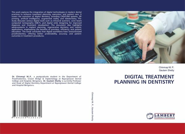 This work explores the integration of digital technologies in modern dental practices to enhance treatment planning, execution, and patient care. It covers the evolution of digital dentistry, including CAD/CAM systems, 3D printing, artificial intelligence, augmented reality, and teledentistry. The study discusses various digital tools such as intraoral scanners, cone beam computed tomography (CBCT), and digital smile designing for improved diagnosis and treatment visualization. The document also highlights advancements in implant planning, regenerative dentistry, and robotic applications, emphasizing the benefits of precision, efficiency, and patient education. The book concludes that digital workflows have revolutionized prosthodontics, offering better predictability, accuracy, and patient outcomes in treatment procedures.