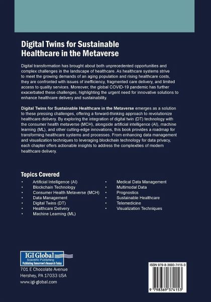 Digital transformation has brought about both unprecedented opportunities and complex challenges in the landscape of healthcare. As healthcare systems strive to meet the growing demands of an aging population and rising healthcare costs, they are confronted with issues of inefficiency, fragmented care delivery, and limited access to quality services. Moreover, the global COVID-19 pandemic has further exacerbated these challenges, highlighting the urgent need for innovative solutions to enhance healthcare delivery and sustainability. Digital Twins for Sustainable Healthcare in the Metaverse emerges as a solution to these pressing challenges, offering a forward-thinking approach to revolutionize healthcare delivery. By exploring the integration of digital twin (DT) technology with the consumer health metaverse (MCH), alongside artificial intelligence (AI), machine learning (ML), and other cutting-edge innovations, this book provides a roadmap for transforming healthcare systems and processes. From enhancing data management and visualization techniques to leveraging blockchain technology for data privacy, each chapter offers actionable insights to address the complexities of modern healthcare delivery.
