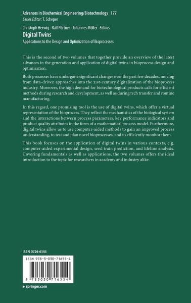 Potential of model-based design of experiments approaches for bioprocess scale-down.- Digital Twins and Their Role in Model-Assisted Design of Experiments.- Digital twins for bioprocess control strategy development and realization.- The Kalman filter for the supervision of cultivation processes.-The challenge of implementing digital twins in operating value chains.- Digital twins in the (bio)pharma industry.- Numerical methods for the design and description of in vitro expansion processes of human mesenchymal stem cells.- Euler-Lagrangian Simulations: A Proper Tool for Predicting Cellular Performance in Industrial Scale Bioreactors.