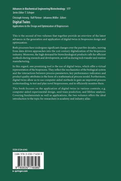 Potential of model-based design of experiments approaches for bioprocess scale-down.- Digital Twins and Their Role in Model-Assisted Design of Experiments.- Digital twins for bioprocess control strategy development and realization.- The Kalman filter for the supervision of cultivation processes.-The challenge of implementing digital twins in operating value chains.- Digital twins in the (bio)pharma industry.- Numerical methods for the design and description of in vitro expansion processes of human mesenchymal stem cells.- Euler-Lagrangian Simulations: A Proper Tool for Predicting Cellular Performance in Industrial Scale Bioreactors.