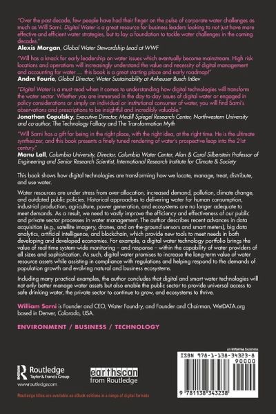 This book shows how digital technologies are transforming how we locate, manage, treat, distribute, and use water. Water resources are under stress from over-allocation, increased demand, pollution, climate change, and outdated public policies. Historical approaches to delivering water for human consumption, industrial production, agriculture, power generation, and ecosystems are no longer adequate to meet demands. As a result, we need to vastly improve the efficiency and effectiveness of our public and private sector processes in water management. The author describes recent advances in data acquisition (e.g., satellite imagery, drones, and on-the-ground sensors and smart meters), big data analytics, artificial intelligence, and blockchain, which provide new tools to meet needs in both developing and developed economies. For example, a digital water technology portfolio brings the value of real-time system-wide monitoring - and response - within the capability of water providers of all sizes and sophistication. As such, digital water promises to increase the long-term value of water resource assets while assisting in compliance with regulations and helping respond to the demands of population growth and evolving natural and business ecosystems. Including many practical examples, the author concludes that digital and smart water technologies will not only better manage water assets but also enable the public sector to provide universal access to safe drinking water, the private sector to continue to grow, and ecosystems to thrive.