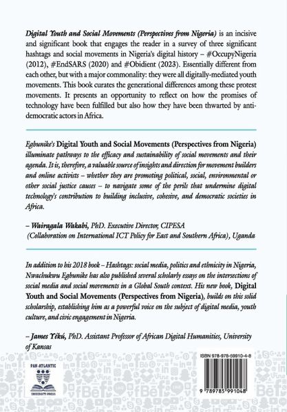 Digital Youth and Social Movements (Perspectives from Nigeria) is an incisive and significant book that engages the reader in a survey of three significant hashtags and social movements in Nigeria's digital history - #OccupyNigeria (2012), #EndSARS (2020) and #Obidient (2023). Essentially different from each other, but with a major commonality: they were all digitally-mediated youth movements. This book curates the generational differences among these protest movements. It presents an opportunity to reflect on how the promises of technology have been fulfilled but also how they have been thwarted by anti-democratic actors in Africa. Egbunike's Digital Youth and Social Movements (Perspectives from Nigeria) illuminate pathways to the efficacy and sustainability of social movements and their agenda. It is, therefore, a valuable source of insights and direction for movement builders and online activists - whether they are promoting political, social, environmental or other social justice causes - to navigate some of the perils that undermine digital technology's contribution to building inclusive, cohesive, and democratic societies in Africa. - Wairagala Wakabi, PhD. Executive Director, CIPESA (Collaboration on International ICT Policy for East and Southern Africa), Uganda In addition to his 2018 book - Hashtags: social media, politics and ethnicity in Nigeria, Nwachukwu Egbunike has also published several scholarly essays on the intersections of social media and social movements in a Global South context. His new book, Digital Youth and Social Movements (Perspectives from Nigeria), builds on this solid scholarship, establishing him as a powerful voice on the subject of digital media, youth culture, and civic engagement in Nigeria. - James Yékú, PhD. Assistant Professor of African Digital Humanities, University of Kansas