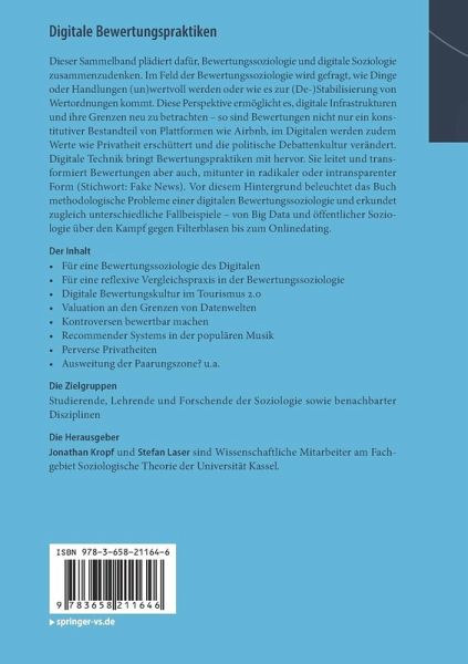 Dieser Sammelband plädiert dafür, Bewertungssoziologie und digitale Soziologie zusammenzudenken. Im Feld der Bewertungssoziologie wird gefragt, wie Dinge oder Handlungen (un)wertvoll werden oder wie es zur (De-)Stabilisierung von Wertordnungen kommt. Diese Perspektive ermöglicht es, digitale Infrastrukturen und ihre Grenzen neu zu betrachten - so sind Bewertungen nicht nur ein konstitutiver Bestandteil von Plattformen wie Airbnb, im Digitalen werden zudem Werte wie Privatheit erschüttert und die politische Debattenkultur verändert. Digitale Technik bringt Bewertungspraktiken mit hervor. Sie leitet und transformiert Bewertungen aber auch, mitunter in radikaler oder intransparenter Form (Stichwort: Fake News). Vor diesem Hintergrund beleuchtet das Buch methodologische Probleme einer digitalen Bewertungssoziologie und erkundet zugleich unterschiedliche Fallbeispiele - von Big Data und öffentlicher Soziologie über den Kampf gegen Filterblasen bis zum Onlinedating.