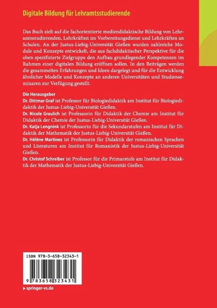 Dr. Dittmar Graf ist Professor für Biologiedidaktik am Institut für Biologiedidaktik an der Justus-Liebig-Universität Gießen. Dr. Nicole Graulich ist Professorin für Didaktik der Chemie am Institut Didaktik der Chemie an der Justus-Liebig-Universität Gießen. Dr. Katja Lengnink ist Professorin für die Sekundarstufen am Institut für Didaktik der Mathematik an der Justus-Liebig-Universität Gießen. Dr. Hélène Martinez ist Professorin für Didaktik der romanischen Sprachen und Literaturen am Institut für Romanistik an der Justus-Liebig-Universität Gießen. Dr. Christof Schreiber ist Professor für die Primarstufe am Institut für Didaktik der Mathematik an der Justus-Liebig-Universität Gießen.