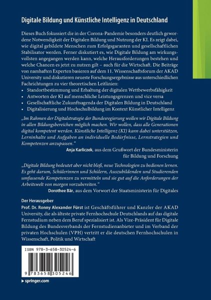 Dieses Buch fokussiert die in der Corona-Pandemie besonders deutlich gewordene Notwendigkeit der digitalen Bildung und Nutzung der KI. Es zeigt dabei, wie digital gebildete Menschen zum Erfolgsgaranten und gesellschaftlichen Stabilisator werden. Ferner diskutiert es, wie Digitale Bildung am wirkungsvollsten angegangen werden kann, welche Herausforderungen bestehen und welche Chancen es jetzt zu nutzen gilt - auch für die Wirtschaft. Die aktuellen Beiträge von namhaften Wissenschaftlern und Praxisvertretern basieren auf dem 11. Wissenschaftsforum der AKAD University und diskutieren neueste Forschungsergebnisse aus unterschiedlichen Fachrichtungen zu vier theoretischen Leitlinien: