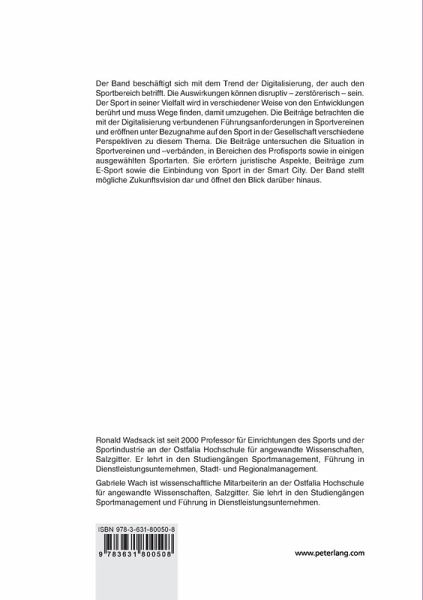Digitale Disruption als Umfeldbedingung für Sportorganisationen (Ronald Wadsack) - Führung in Sportvereinen (-verbänden) und Megatrend Digitalisierung (Ronald Wadsack) - Digitalisierung und Sport: Sportsoziologische Perspektiven auf den sozialen Wandel in der Sportlandschaft (Sebastian Braun / Stefan Hansen) - Datenschutzrechtliche Aspekte der Digitalisierung im Sport (Rainer Cherkeh / Andreas Hampe) - Stand der Digitalisierung in den Sportvereinen (Katja Stamer) - Digitalisierung und das System des organisierten Sports (Jörg Ammon / Lutz Thieme) - VR, AR, Drohnen und 360-Grad-Kameras - die Zukunft von Sportmanagement und Sportkommunikation mit einem Blick auf die Situation in den USA (Brody Ruihley / Andreas Hebbel-Seeger / Thomas Horky) - Digitalisierung im Fußballstadion - Was will der Fan wirklich? (Eva Luise Uhlig) - Digitale Transformation in der Pferdewirtschaft (Christina Münch / David Wewetzer) - Digitale Transformation und Wandern (Heinz-Dieter Quack) - Digitalisierung in der Fitnessbranche (Oliver Schumann) - E-Sport - Markt, Strukturen und Chancen für Sportvereine (Markus Breuer) - Ausblick: Sport in der Smart City (Ronald Wadsack) - Szenario. Der digitalisierte Sportverein in einem digitalisierten Sportsystem (Gabriele Wach / Ronald Wadsack)