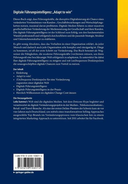Dieses Buch zeigt, dass Führungskräfte, die disruptive Digitalisierung als Chance eines veränderten Verständnisses von Kunden-, Geschäftsbeziehungen und Wertschöpfungsketten nutzen, maximal davon profitieren. Digitale Medien führen zu einer massiven gesellschaftlichen Veränderung der Mediennutzung der Gesellschaft und ihrer Kunden. Die digitale Führungsintelligenz ist der Schlüssel zum Erfolg, um den fundamentalen Wandel professionell und erfolgreich durchzuführen und die passende Strategie, Struktur und Unternehmenskultur zu etablieren.