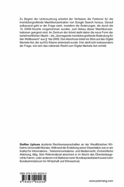 Zu Beginn der Untersuchung arbeitet der Verfasser die Faktoren für die marktübergreifende Machtkonzentration von Google Search heraus. Darauf aufbauend geht er der Frage nach, inwiefern die Änderungen, die durch die 10. GWB-Novelle vorgenommen wurden, zum Abbau dieser Machtkonzentrationen geeignet sind. Im Zentrum der Arbeit steht dabei die neue Form der kartellrechtlichen Macht - die "überragende marktübergreifende Bedeutung für den Wettbewerb" aus § 19a GWB. Den Abschluss bildet ein Blick auf den Digital Markets Act, der auf EU-Ebene entwickelt wurde. Hier stellt sich insbesondere die Frage, wie sich das nationale Recht zum Digital Markets Act verhält.