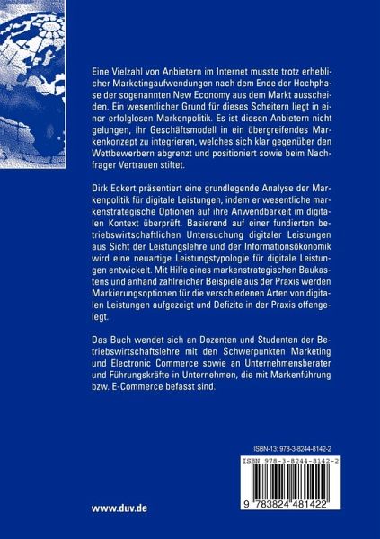 Dirk Eckert präsentiert eine grundlegende Analyse der Markenpolitik für digitale Leistungen, indem er wesentliche markenstrategische Optionen auf ihre Anwendbarkeit im digitalen Kontext überprüft. Basierend auf einer fundierten betriebswirtschaftlichen Untersuchung digitaler Leistungen aus Sicht der Leistungslehre und der Informationsökonomik wird eine neuartige Leistungstypologie für digitale Leistungen entwickelt. Mit Hilfe eines markenstrategischen Baukastens und anhand zahlreicher Beispiele aus der Praxis werden Markierungsoptionen für die verschiedenen Arten von digitalen Leistungen aufgezeigt und Defizite in der Praxis offengelegt.