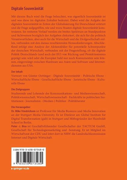 Mit diesem Buch wird die Frage beleuchtet, was eigentlich Souveränität ist und was diese im digitalen Zeitalter bedeutet. Dabei wird die Aufgabe der digitalen Souveränität in Zeiten der Globalisierung für Deutschland erörtert und die Frage aufgegriffen, wie und wozu Staaten digitale Souveränität konstruieren. Im weiteren Verlauf werden ein breites Spektrum an Standpunkten und Sichtweisen bezüglich der Aufgaben diskutiert, die sich für die politisch Verantwortlichen, aber auch für die Wirtschaft und die Zivilgesellschaft stellen, verbunden mit den daraus resultierenden Herausforderungen. Abschließend erfolgt eine Analyse der Aktionsfelder für potentielle Schwerpunkte der deutschen Wirtschaft, verbunden mit der Fragestellung, ob die digitale Politik Deutschlands (und auch der EU) von Rückzug und Protektionismus geprägt sein wird oder die Europäer bald nur noch Konsumenten sein können, eingezwängt zwischen Hardware aus Asien und Software und Internetdiensten aus USA .