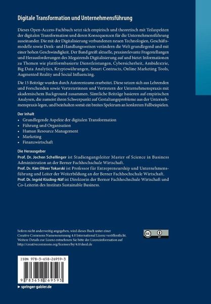 Dieses Open Access-Fachbuch setzt sich empirisch und theoretisch mit Teilaspekten der digitalen Transformation und deren Konsequenzen für die Unternehmensführung auseinander. Die mit der Digitalisierung verbundenen neuen Technologien, Geschäftsmodelle sowie Denk- und Handlungsweisen verändern die Welt grundlegend und mit einer hohen Geschwindigkeit. Der Band greift aktuelle, praxisrelevante Fragestellungen und Herausforderungen des Megatrends Digitalisierung auf, die in den folgenden vier Themenblöcken behandelt werden: (1) Grundlagen der Digitalen Transformation, (2) Human Resource Management und Organisation, (3) Finanzwirtschaft und (4) Marketing. Das Buch enthält unter anderem Beiträge zu den Themen:Bedeutung von Open Access im digitalen Zeitalter