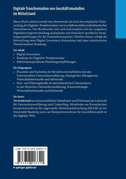 Dieses Buch umfasst sowohl eine theoretische als auch eine empirische Untersuchung der Digitalen Transformation von Geschäftsmodellen mittelständischer Unternehmen. Tim Botzkowski setzt sich insbesondere mit der originären Digitalisierungsentscheidung auseinander und formuliert spezifische Handlungsempfehlungen für die Unternehmenspraxis. Darüber hinaus erfolgt die Entwicklung einer Digital Governance-Konzeption und einer strukturierten Transformations-Roadmap.