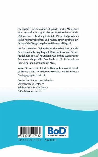 Die digitale Transformation ist gerade für den Mittelstand eine Herausforderung. In diesem Praxisleitfaden finden Unternehmen Handlungsbeispiele. Diese sind praxisnah, leicht nachzuvollziehen und haben einen direkten Einfluss auf die Steigerung der Wettbewerbsfähigkeit.Im Buch werden Digitalisierung-Best-Practices aus den Bereichen Marketing, Logistik, Kundendienst und Service, Produktion, Einkauf, Finanzen & Controlling sowie Human Resources dargestellt. Das Buch ist für Unternehmer, Führungs- und Fachkräfte ein Muss.