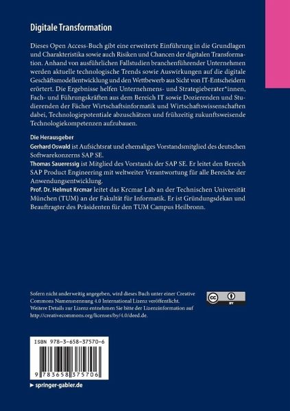 Dieses Open Access-Buch gibt eine erweiterte Einführung in die Grundlagen und Charakteristika sowie auch Risiken und Chancen der digitalen Transformation. Anhand von ausführlichen Fallstudien branchenführender Unternehmen werden aktuelle technologische Trends sowie Auswirkungen auf die digitale Geschäftsmodellentwicklung und den Wettbewerb aus Sicht von IT-Entscheidern erörtert. Die Ergebnisse helfen Unternehmens- und Strategieberater_innen, Fach- und Führungskräften aus dem Bereich IT sowie Dozierenden und Studierenden der Fächer Wirtschaftsinformatik und Wirtschaftswissenschaften dabei, Technologiepotentiale abzuschätzen und frühzeitig zukunftsweisende Technologiekompetenzen aufzubauen.