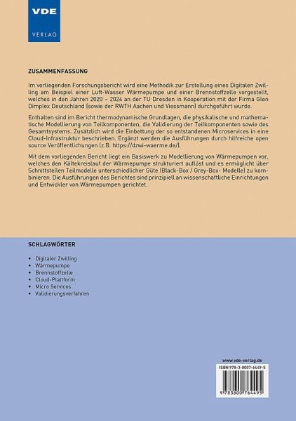 Im vorliegenden Forschungsbericht wird eine Methodik zur Erstellung eines Digitalen Zwilling am Beispiel einer Luft-Wasser Wärmepumpe und einer Brennstoffzelle vorgestellt, welches in den Jahren 2020 - 2024 an der TU Dresden in Kooperation mit der Firma Glen Dimplex Deutschland (sowie der RWTH Aachen und Viessmann) durchgeführt wurde.Enthalten sind im Bericht thermodynamische Grundlagen, die physikalische und mathematische Modellierung von Teilkomponenten, die Validierung der Teilkomponenten sowie des Gesamtsystems. Zusätzlich wird die Einbettung der so entstandenen Microservices in eine Cloud-Infrastruktur beschrieben. Ergänzt werden die Ausführungen durch hilfreiche open source Veröffentlichungen (z.B. https://dzwi-waerme.de/).Mit dem vorliegenden Bericht liegt ein Basiswerk zu Modellierung von Wärmepumpen vor, welches den Kältekreislauf der Wärmepumpe strukturiert auflöst und es ermöglicht über Schnittstellen Teilmodelle unterschiedlicher Güte (Black-Box / Grey-Box-Modelle) zukombinieren. Die Ausführungen des Berichtes sind prinzipiell an wissenschaftliche Einrichtungen und Entwickler von Wärmepumpen gerichtet.