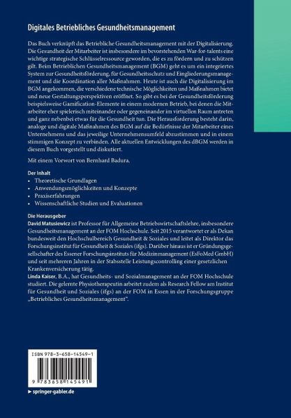 Das Buch verknüpft das Betriebliche Gesundheitsmanagement mit der Digitalisierung von Gesundheitsthemen, was generell neue technische Möglichkeiten bietet. Die Gesundheit der Mitarbeiter ist insbesondere im bevorstehenden war-for-talents eine wichtige strategische Schlüsselressource geworden, die es zu fördern und zu schützen gilt. Beim Betrieblichen Gesundheitsmanagements(BGM) geht es um ein integriertes System zur Gesundheitsförderung, Gesundheitsschutz und Eingliederungsmanagement und die Koordination aller Maßnahmen. Heute ist auch die Digitalisierung im BGM angekommen, die verschiedene technische Möglichkeiten und Maßnahmen mit sich bringt. So gibt es bei der Gesundheitsförderung bspw. Gamification-Elemente in einem modernen Betrieb, bei denen die Mitarbeiter eher spielerisch miteinander oder gegeneinander im virtuellen Raum antreten und ganz nebenbei etwas für die Gesundheit tun. Alle aktuellen Entwicklungen werden in diesem Buch vorgestellt und diskutiert.