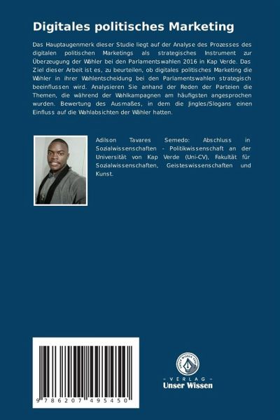 Das Hauptaugenmerk dieser Studie liegt auf der Analyse des Prozesses des digitalen politischen Marketings als strategisches Instrument zur Überzeugung der Wähler bei den Parlamentswahlen 2016 in Kap Verde. Das Ziel dieser Arbeit ist es, zu beurteilen, ob digitales politisches Marketing die Wähler in ihrer Wahlentscheidung bei den Parlamentswahlen strategisch beeinflussen wird. Analysieren Sie anhand der Reden der Parteien die Themen, die während der Wahlkampagnen am häufigsten angesprochen wurden. Bewertung des Ausmaßes, in dem die Jingles/Slogans einen Einfluss auf die Wahlabsichten der Wähler hatten.