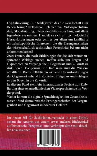 Digitalisierung - Ein Schlagwort, das die Gesellschaft zum Beben bringt? Netzwerke, Telemedizin, Videosprechstunden, Globalisierung, Interoperabilität - alles hängt mit allem irgendwie zusammen. Handelt es sich um technologische Herausforderungen oder geht es vor allem um knallharte wirtschaftspolitische Interessen, die die Errungenschaften des wissenschaftlich-technischen Fortschritts bei uns nicht ankommen lassen? Zwei Frauen, die nach Erklärungen für die sich weiter zuspitzende Weltlage suchen, treffen sich, um Fragen und Hypothesen zu Vergangenheit, Gegenwart und Zukunft zu diskutieren. Die Journalistin Katharina und die Wissenschaftlerin Romy reflektieren aktuelle Herausforderungen der Gegenwart anhand historischer Ereignisse und schlagen so den Bogen in die Zukunft. In diesem Band steht ein internationales Projekt zur Etablierung einer telemedizinischen Videosprechstunde im Vordergrund. Woher kommt die digitale Sprachlosigkeit im Gesundheitswesen? Sind demokratische Errungenschaften der Vergangenheit und Gegenwart in höchster Gefahr?