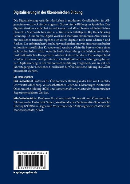 Dirk Loerwald ist Professor für Ökonomische Bildung an der Carl von Ossietzky Universität Oldenburg, Wissenschaftlicher Leiter des Oldenburger Instituts für Ökonomische Bildung (IÖB) und Wissenschaftlicher Leiter des ökonomischen Experimentallabors Ox-Lab. Nils Goldschmidt ist Professor für Kontextuale Ökonomik und Ökonomische Bildung an der Universität Siegen, Vorsitzender des Zentrums für ökonomische Bildung (ZÖBIS) in Siegen und Vorsitzender der Aktionsgemeinschaft Soziale Marktwirtschaft (ASM).