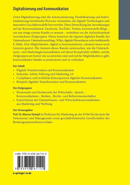 Unter Digitalisierung wird die Autonomisierung, Flexibilisierung und Individualisierung bestehender Prozesse verstanden, die digitale Technologien und innovative Geschäftsmodelle hervorrufen. Diese Entwicklung hat Auswirkungen auf die Kommunikation: Facebook, YouTube, Twitter, kommerzielle Blogs - um nur einige externe Kanäle zu nennen - wetteifern um die Aufmerksamkeit verschiedener Zielgruppen. Hinzu kommen die eigenen digitalen Kanäle der Unternehmen: Unternehmensblogs, Wikis, digitale Presseräume oder traditionelle E-Mails. Den Möglichkeiten, digital zu kommunizieren, scheinen kaum noch Grenzen gesetzt. Die Autoren dieses Bandes untersuchen, wie die Unternehmens- und Marketingkommunikation mit dieser Komplexität verfährt, welche Zielgruppen am besten wie zu erreichen sind und welche Möglichkeiten es gibt, kommunikative Inhalte zu produzieren und zu verbreiten.